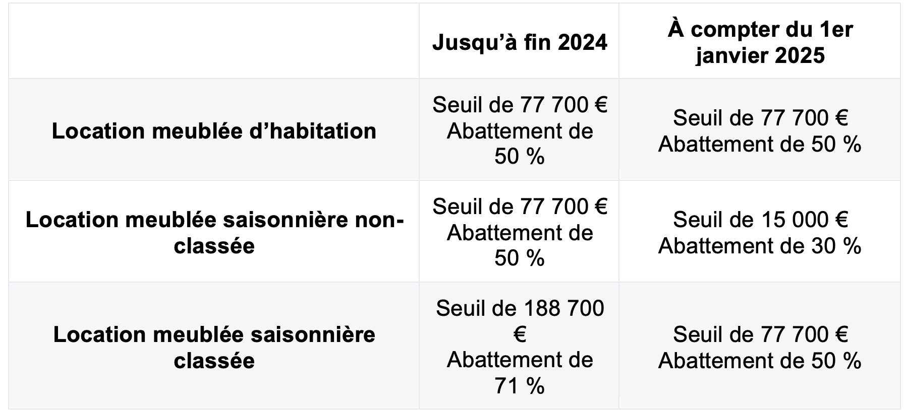 - Pour les meublés de tourisme non classés, le plafond est limité à 15 000 €, avec un abattement réduit à 30 %.