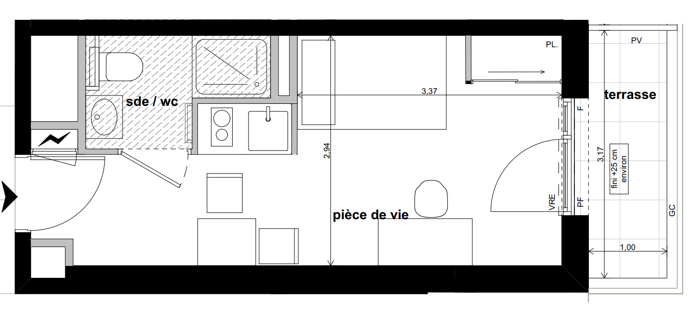 Les studios tous meublés et équipés, sont complétés par des espaces partagés : cuisine et salle commune, terrasse paysagée et laverie.