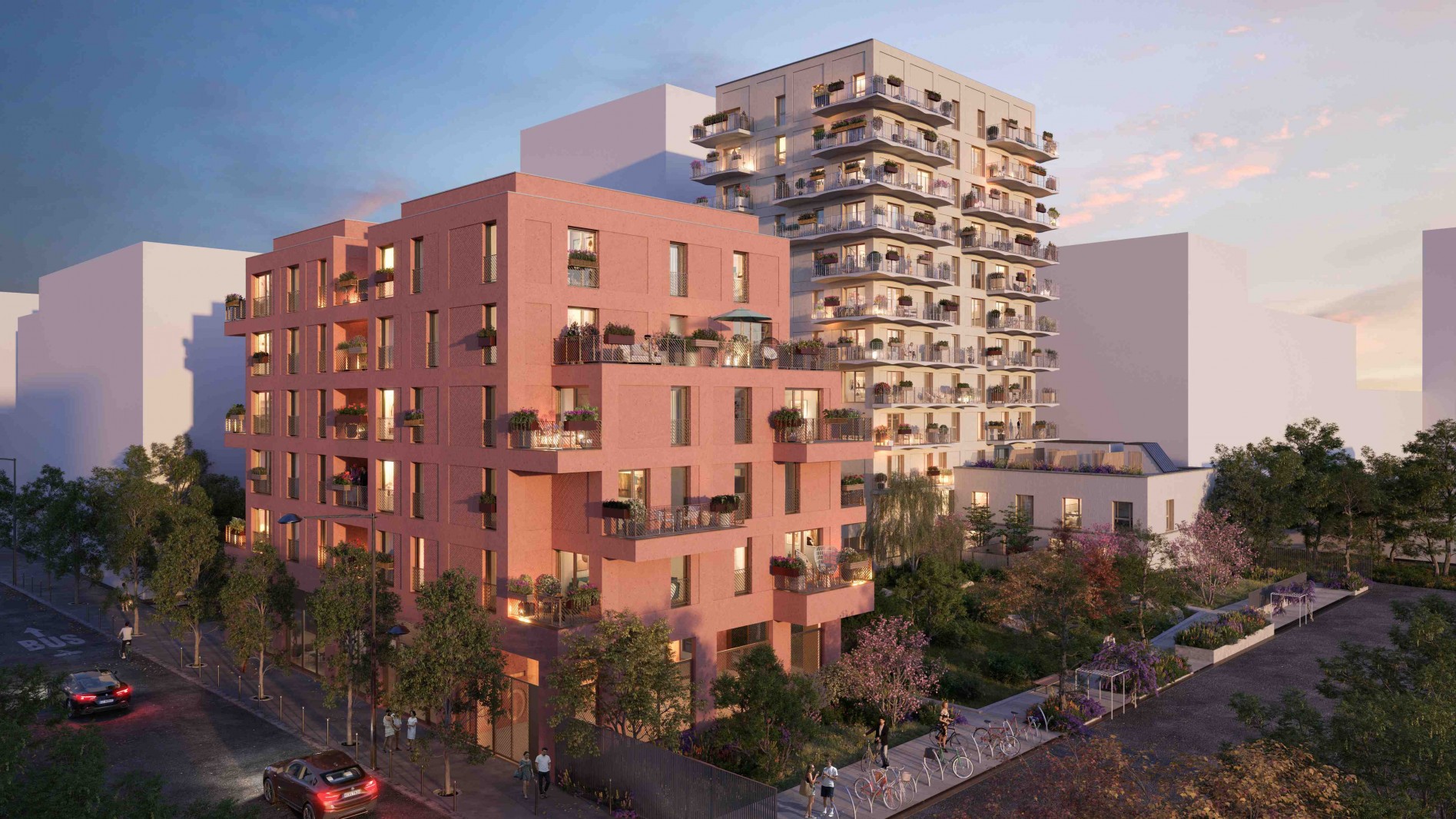 En sous-sol, des stationnements sécurisés — pour la plupart des logements — avec bornes de recharge pour véhicules électriques.