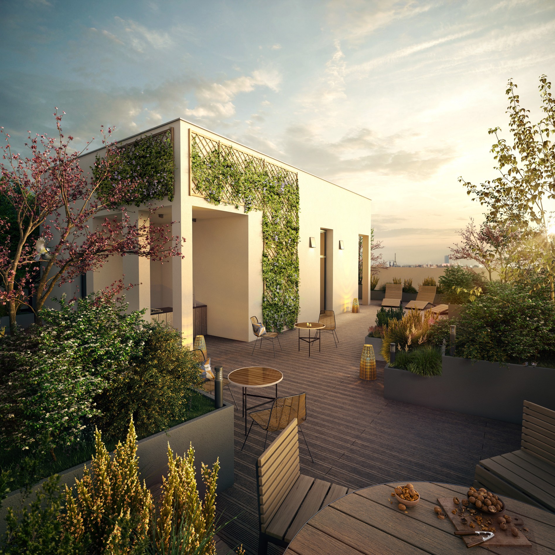 Une toiture-terrasse partagée et paysagère à disposition de la copropriété et de ses résidents au R+16, avec cuisine, sanitaire, tables, bancs et chaises longues fixes