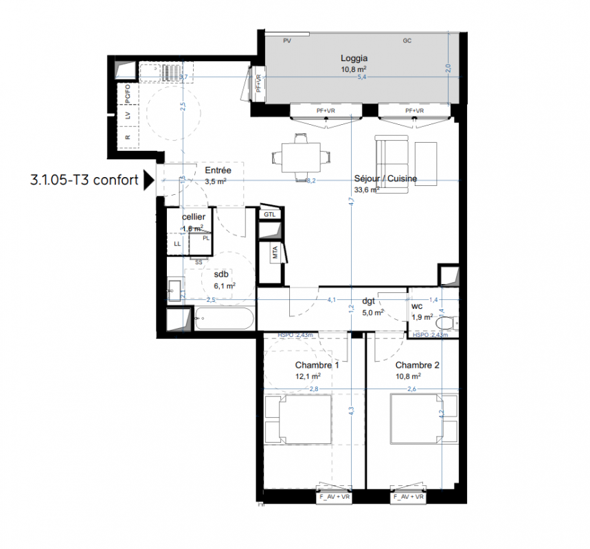 328 999€ Appt. T3 65m2 9ème