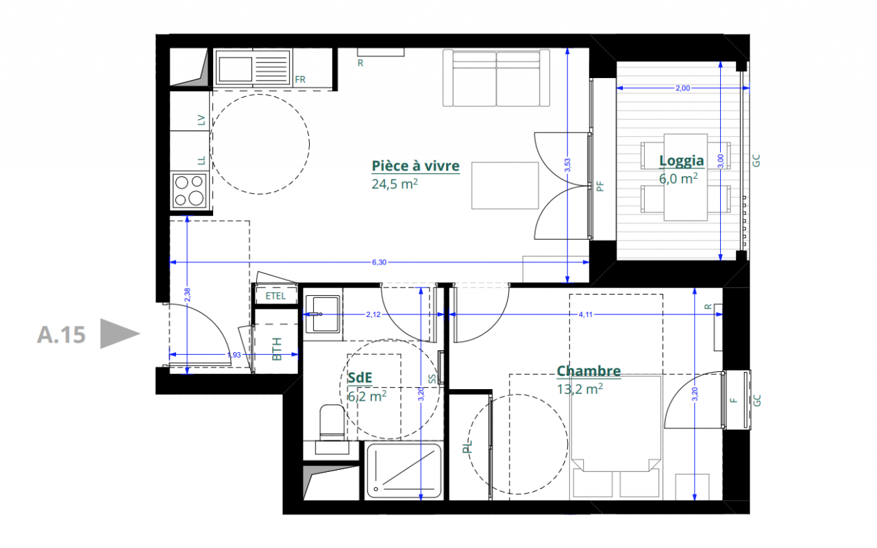 | Voir | Disponible | 217 000€ | A106 | Appt. | T2 | 46m2 | 1er | Disponible | 217 000€ | Voir |
