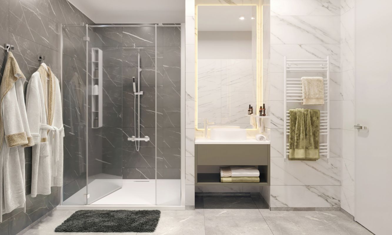 Pompe à chaleur réversible pour le chauffage et la climatisationSèche-serviettes électriquesMeuble vasque avec miroir et bandeau LEDPare-douches et pare-bainsCuisine meubl...