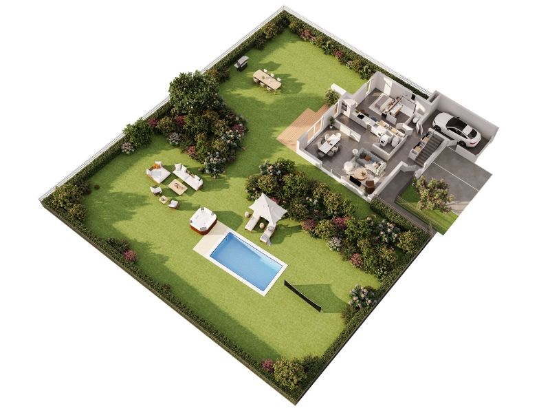 Les villas T4 et T5 bénéficient d'un grand terrain avec piscine et possibilité d'ajouter un jacuzzi, ainsi que d'un garage et de stationnements extérieurs.